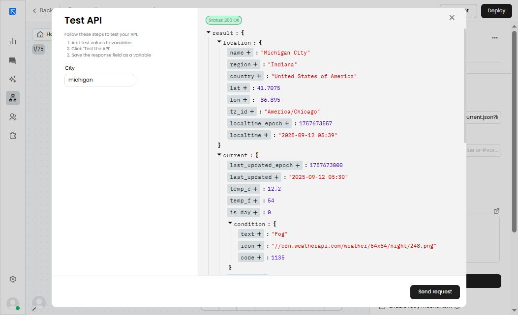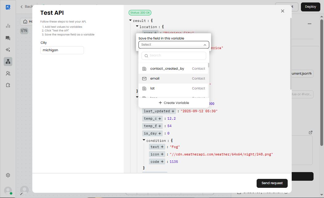You can further store the responses received from the API into the variables which can be further used in the bot flow or bot message. **ReplyCX** follows the dot pattern to store the responses into the variables. Below are a few of the ways in which the path can be defined.