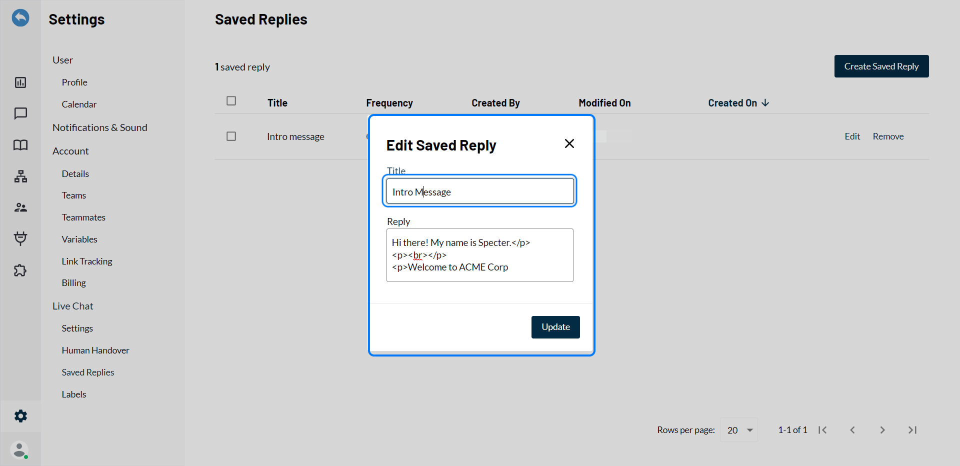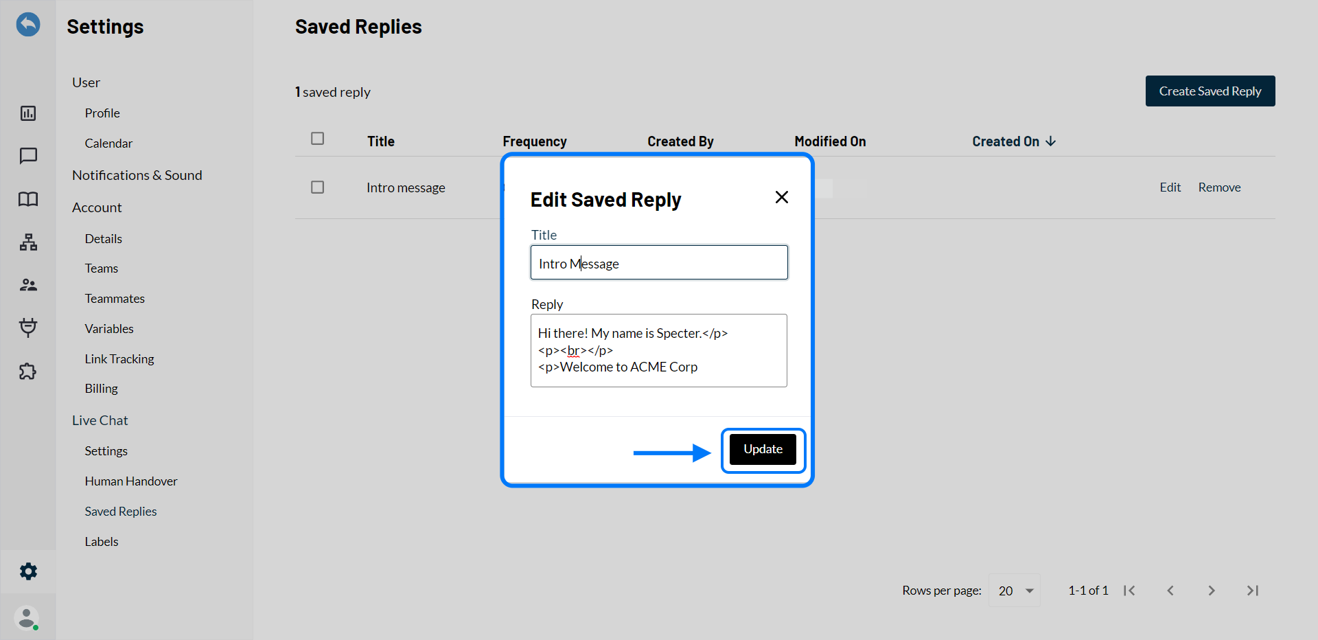 **Step 7:** Click on **‘Update’** to update the title or message of the saved reply.
