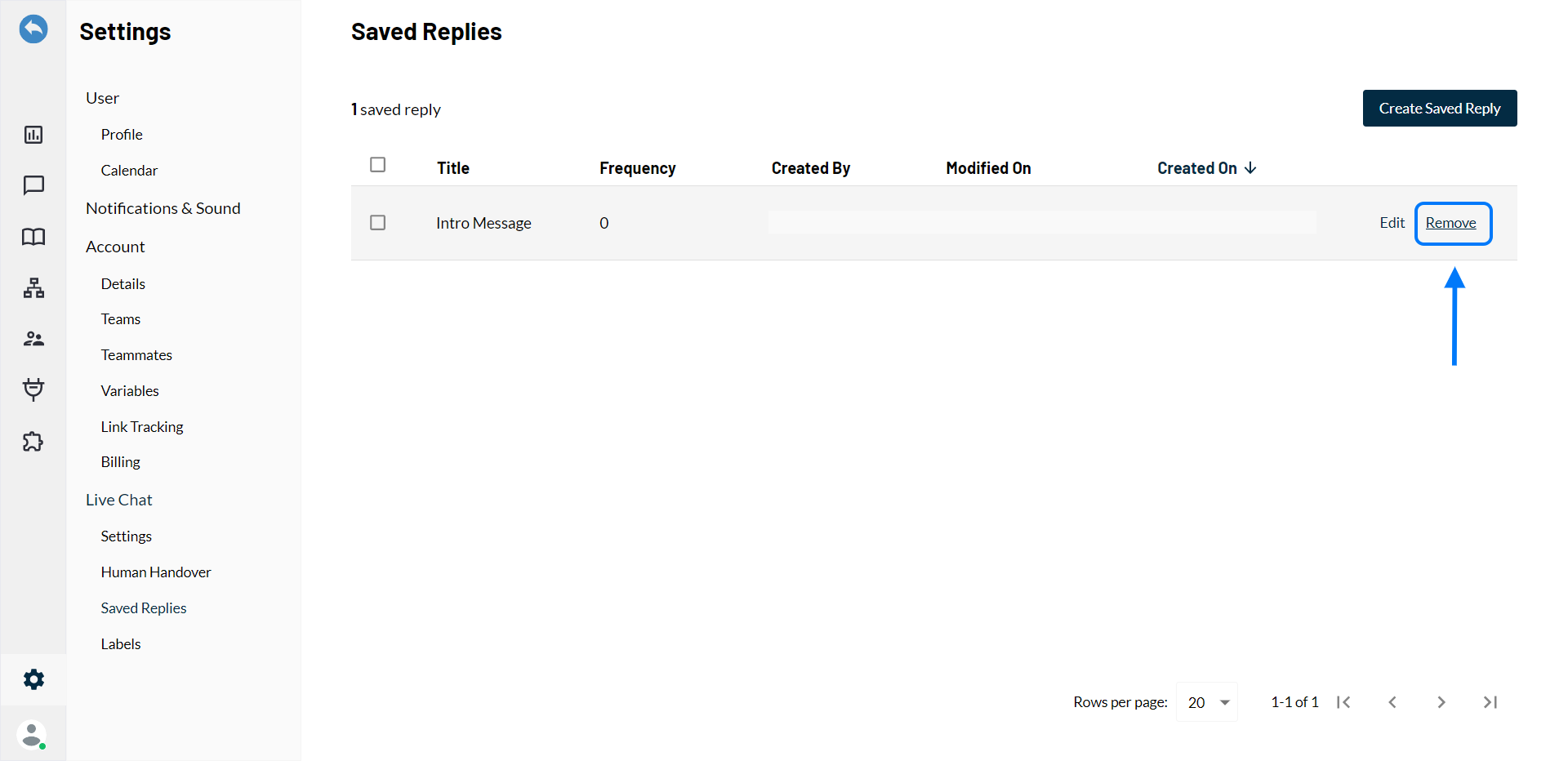 Step 2: Click on **'Remove'** against the saved reply that you want to remove or delete.