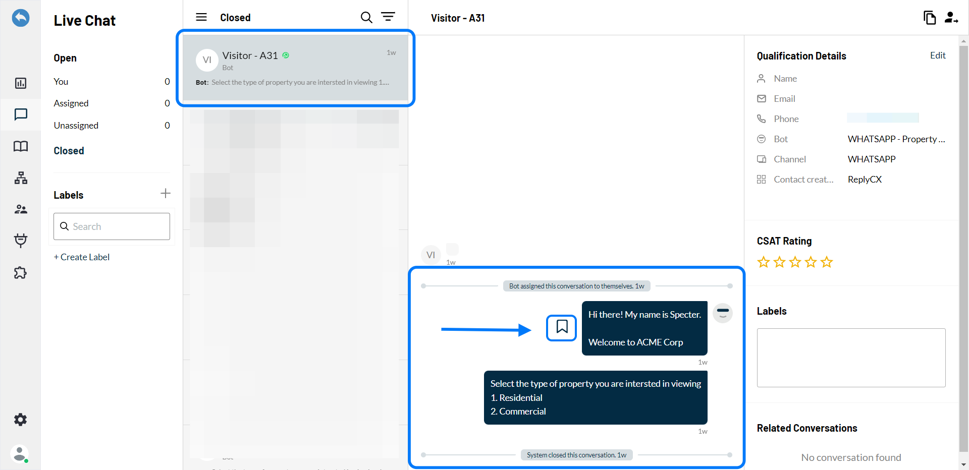 **Step 2:** Click on **'Bookmark'** to access the saved replies.