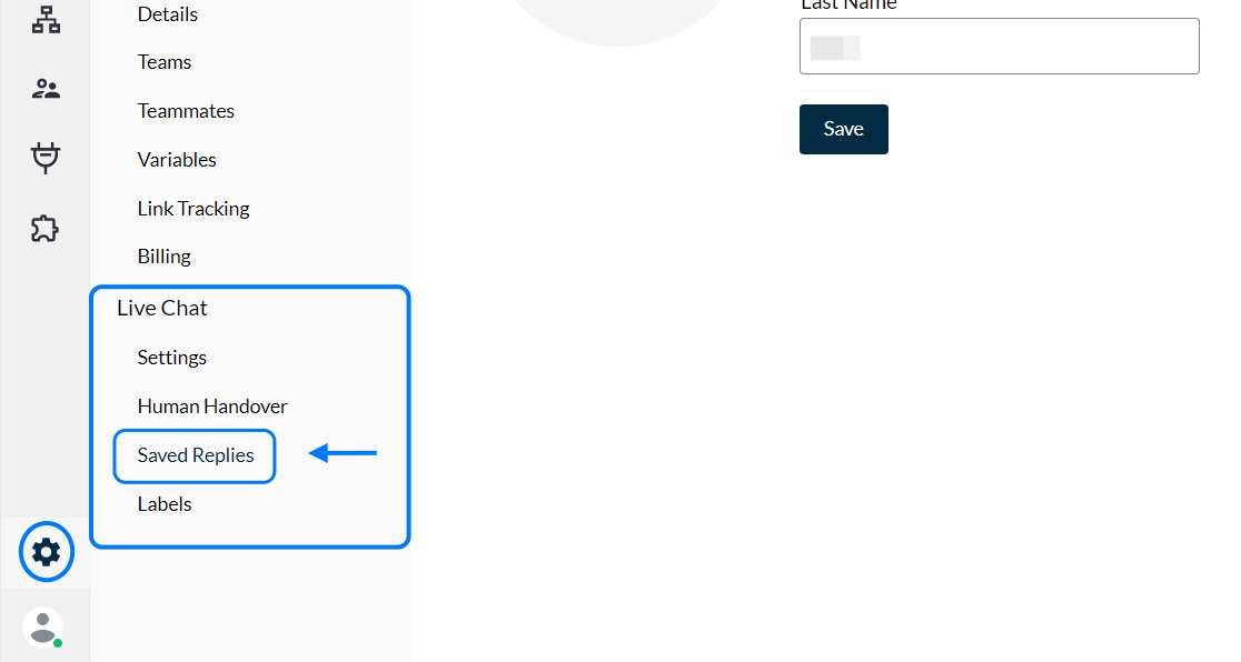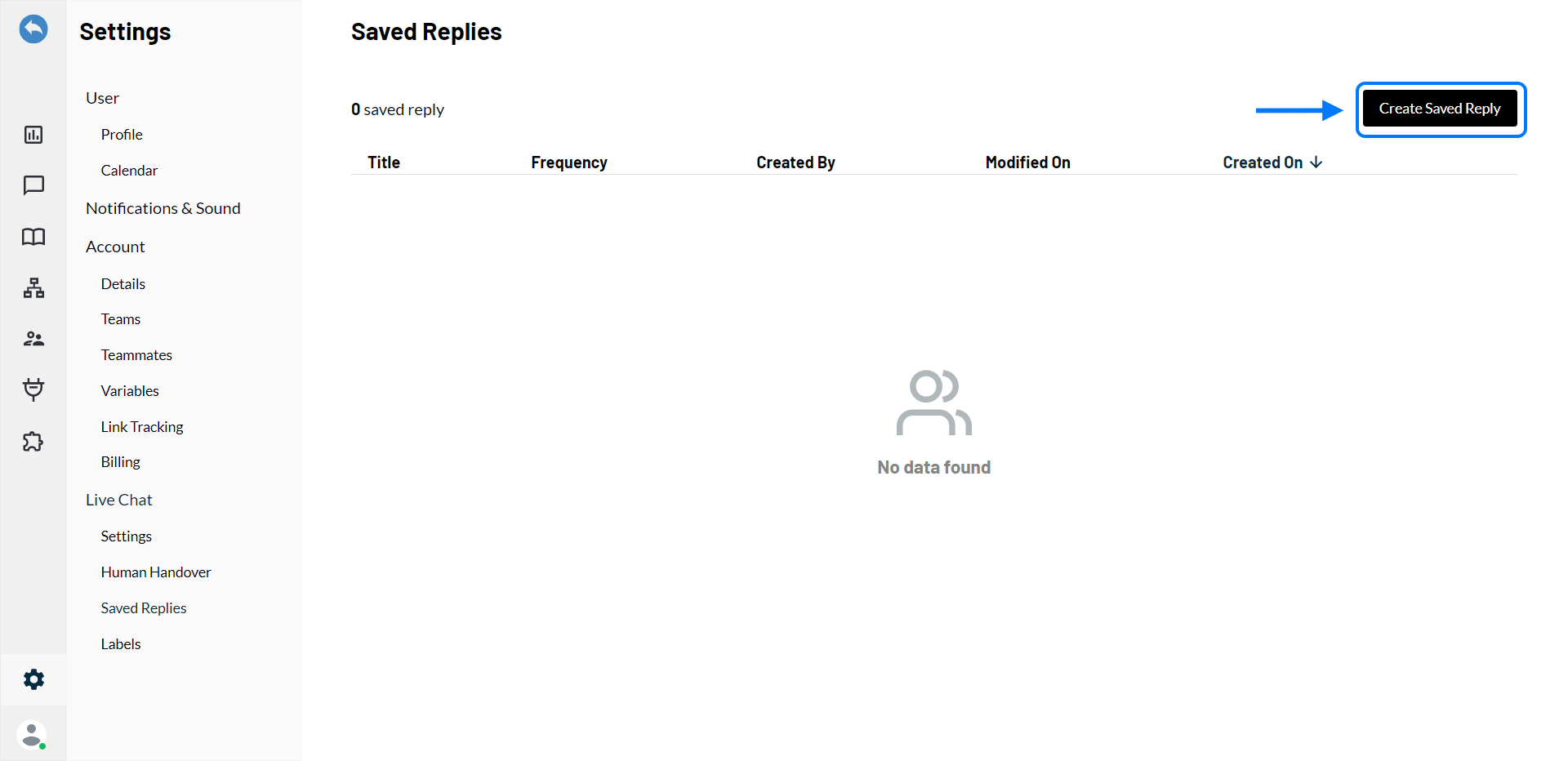 **Step 1:** Go to **'Settings -> Live Chat -> Saved Replies'.**<br>