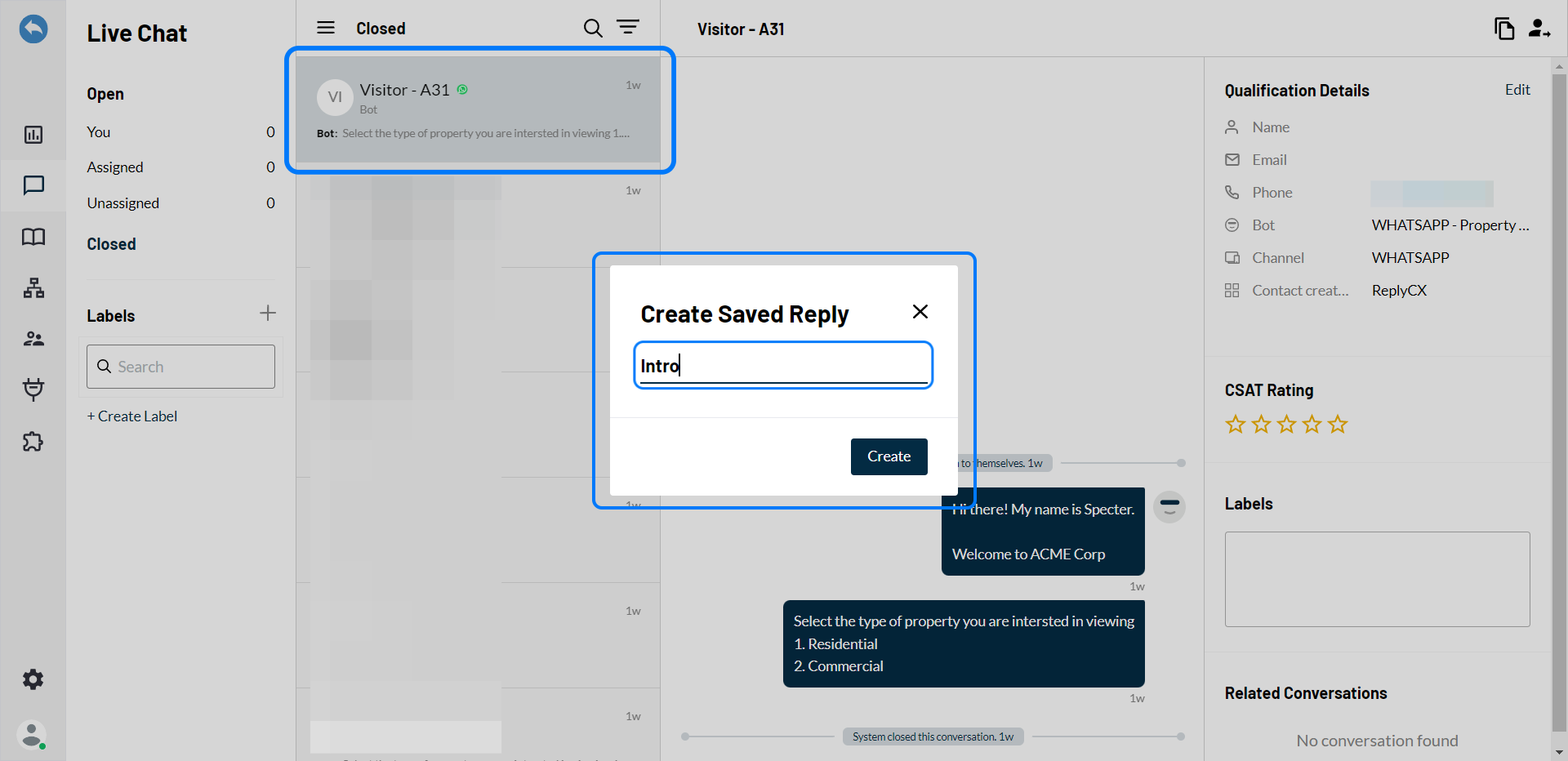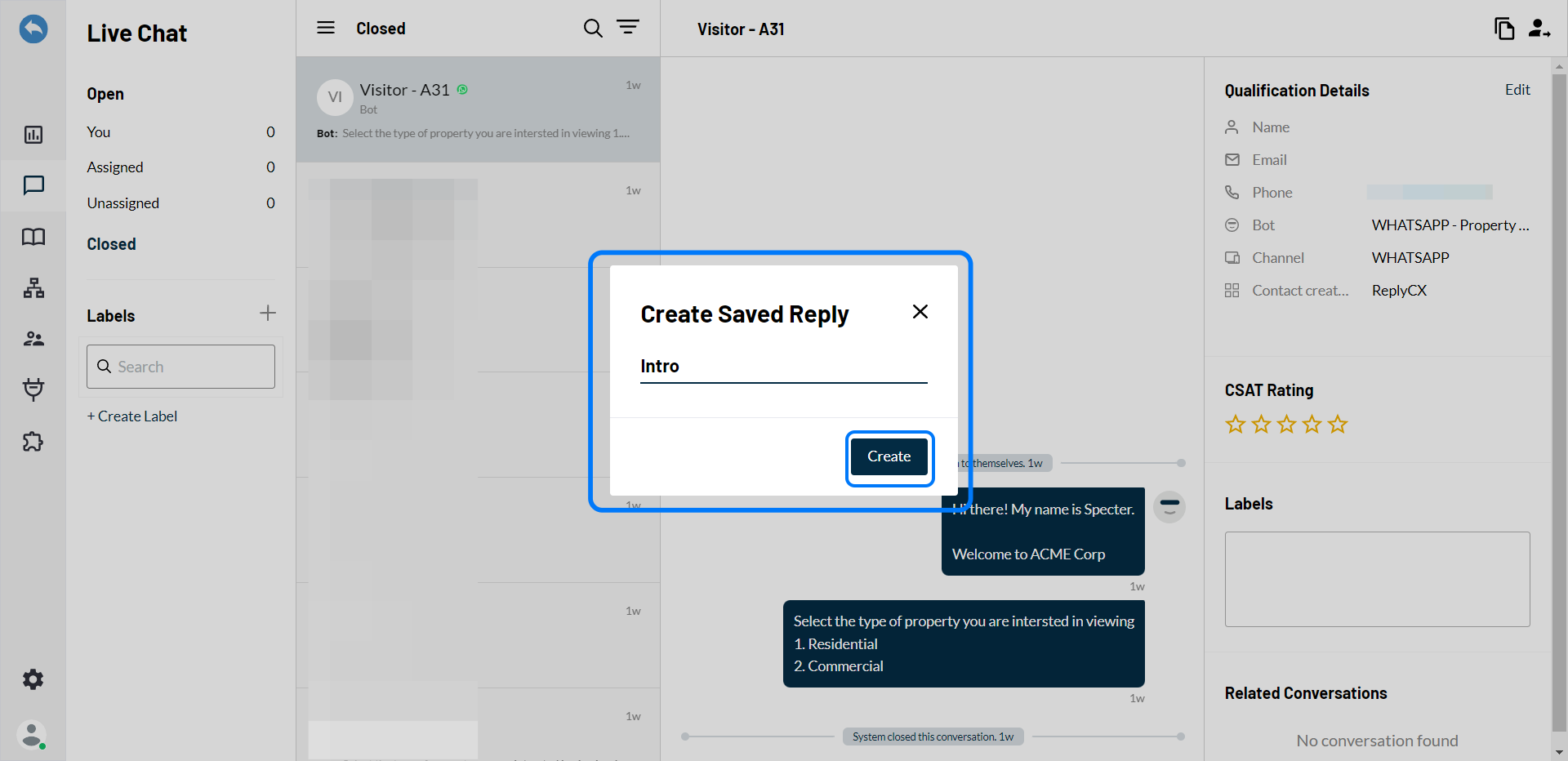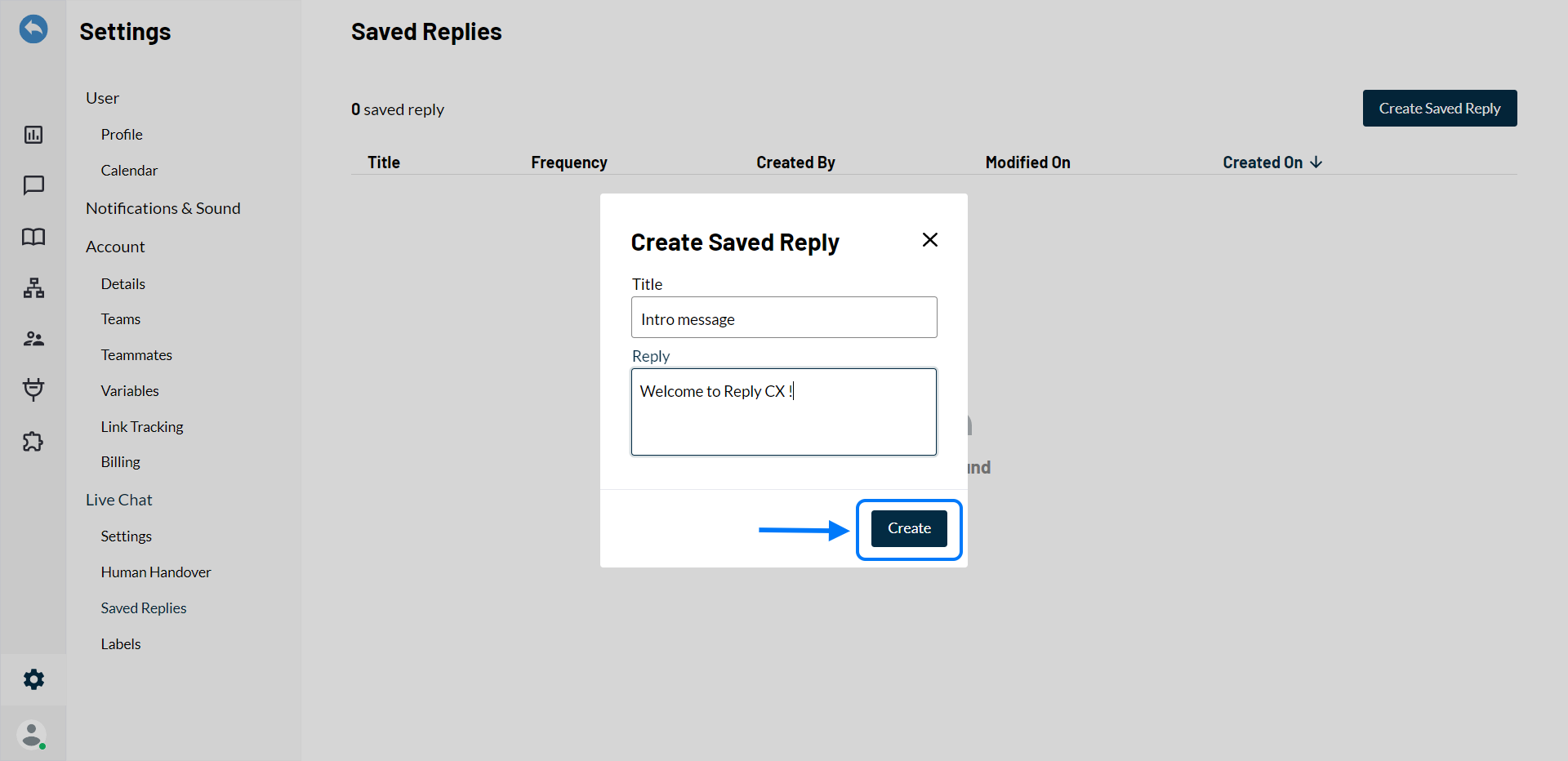 **Step 4:** Click on **'Create'** to create a saved reply.